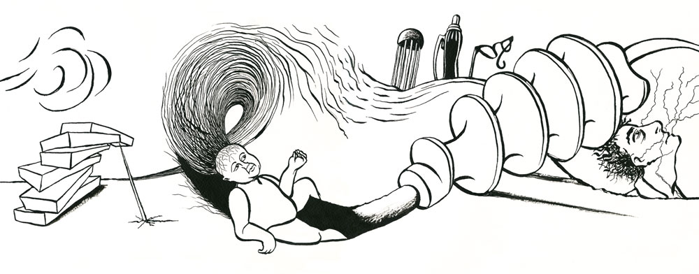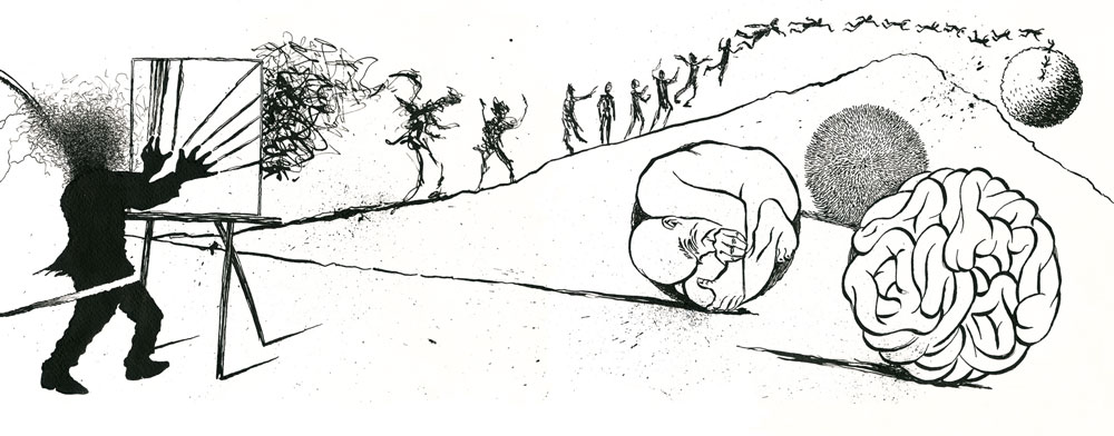 Irgendwann, irgendwie lag der Name plötzlich auf dem Tisch. Genau genommen, auf dem Küchentisch. Peter Rühmkorf. Peter Rühmkorf? Wer war das? Ich hatte den Namen schon irgendwann gehört, jedoch keine Ahnung mehr in welchem Zusammenhang. Ein TV-Journalist? Ein Sportler? Ein Politiker? Nur wenige Wochen später steckte ich bereits überwältigt von seinem Oeuvre in dem großartigen Abenteuer, einem Dichter auf so unterschiedlichen Ebenen zu begegnen. Ich lernte über seine Gedichte, Tagebucheintragungen und Essays einen der ganz Großen des 20. Jahrhunderts kennen, ohne ihn jedoch wirklich zu begreifen. Erst als ich begann, ihm als Zeichner entgegenzutreten, über Linien und Flächen, figürlich und abstrakt seine Worte in Bilder zu übertragen, fiel es mir leichter, ihm zu folgen. Aus diesen imaginären literarisch-zeichnerischen Dialogen wuchs das Buch „Rühmkorfs Ei“, das von seiner Entstehungsphase und den ersten Schritten berichtet. Darüber hinaus erzählt es von einer fiktiven Begegnung mit dem Dichter, aber vor allem beinhaltet es eine etwa dreissig Meter breite, horizontallaufende, zusammenhängende Zeichnung – verteilt auf einhundertzwanzig Buchseiten. Aus dem erweiterten Material wurde auch ein Film geschnitten, der live mit Axel Garbelmann als Rezitator der Rühmkorf-Gedichte und musikalischen Improvisationen auf dem Kontrabass von Sven Krug aufgeführt wurde.